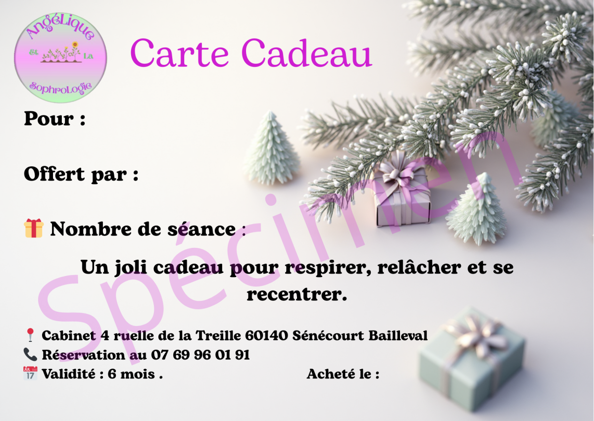✨ Chaque carte cadeau permet de vivre une séance de sophrologie personnalisée, pour se détendre, relâcher les tensions et retrouver confiance.